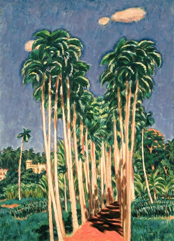 天を突く檳榔樹(びんろうじゅ)の並木。白い雲が青空にぽっかり浮かび、黒い影が赤土の道に落ちています。奥へと誘う道の両側にも、緑滴る熱帯の植物がさまざまに繁茂し、「南国」の熱い日差しを浴びています。
