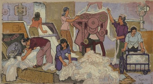 長きにわたる戦争とプロパガンダによって作り上げられた勤勉な労働者としての姿は、戦後においても理想の市民像でした。戦後に描かれた《洗濯工場》に登場する、ズボンをはいて労働に勤しむ女性の姿は、社会主義国家における理想の女性の姿として描かれています。