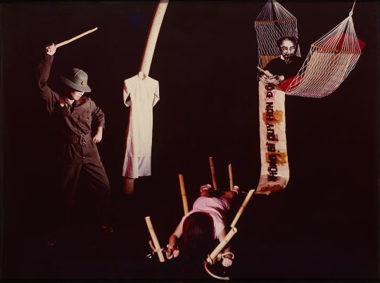 ハン・ティ・ファムは、ベトナム戦争終結前の1975年に、ボート・ピープルとしてアメリカへのがれた作家。《であるということは》は、自らが被写体となって、セッティングされた情景の中に登場するという演劇的に演出された作品です。勇ましい兵士、アオザイ、星条旗など、さまざまなモチーフを用いて、ベトナム戦争のトラウマ的な記憶や、ベトナムに対する人種的・ジェンダー的ステレオタイプへの抵抗を、自らの身体で表現しています。