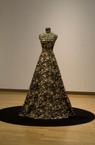 チュオン・タンは、90年代にパフォーマンスなどを通じて、プロパガンダや社会主義的な表現が主流のベトナム美術に対して反旗を翻した先駆的アーティスト。彼の作品《平和の母》では、迷彩布でできた女性像に「平和」の題を冠することで、戦時に語られた「平和のための戦争」の言葉の空虚さを物語ります。また、戦時のプロパガンダ表現において、「母」のイメージが祖国統一の理想のために掲げられた一方で、子どもたちを失い英雄として顕彰された「英雄の母」のその痛みに満ちた現実も想起させます。