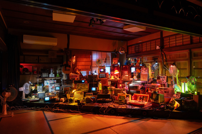 この作品は、扇風機やブラウン管テレビ、電気スタンドやジューサーミキサーといったアナログ家電製品がオーケストラを奏でる作品となっており、今回の山口バージョンでは会期中、「黒子」による上演と自動演奏による上演の2パターンをお楽しみいただけます(日時は以下を参照)