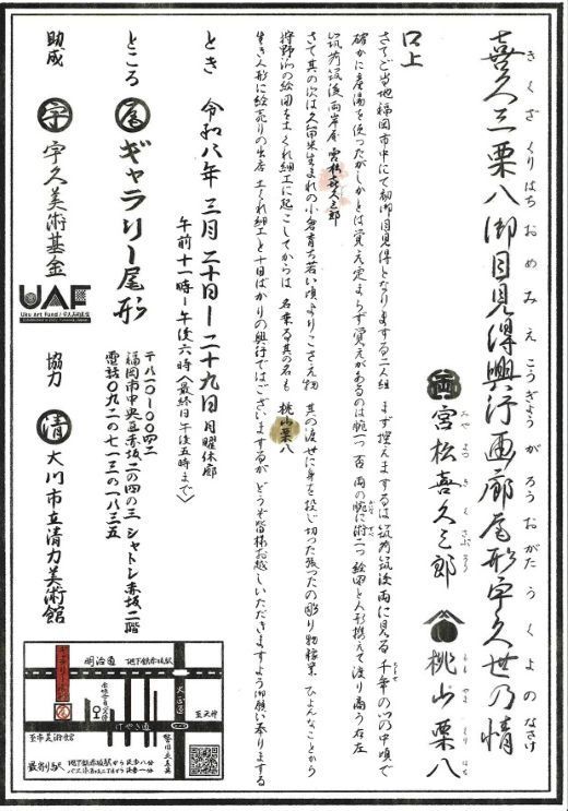 福岡県を拠点に活動する絵図と人形制作者の宮松喜久三郎と、かたち師の桃山栗八が福岡市に初御目見え、「喜久三栗八御目見興行画廊尾形宇久世乃情」と銘打つ江戸の興行のおもむきを感じさせる美術展を開催します。