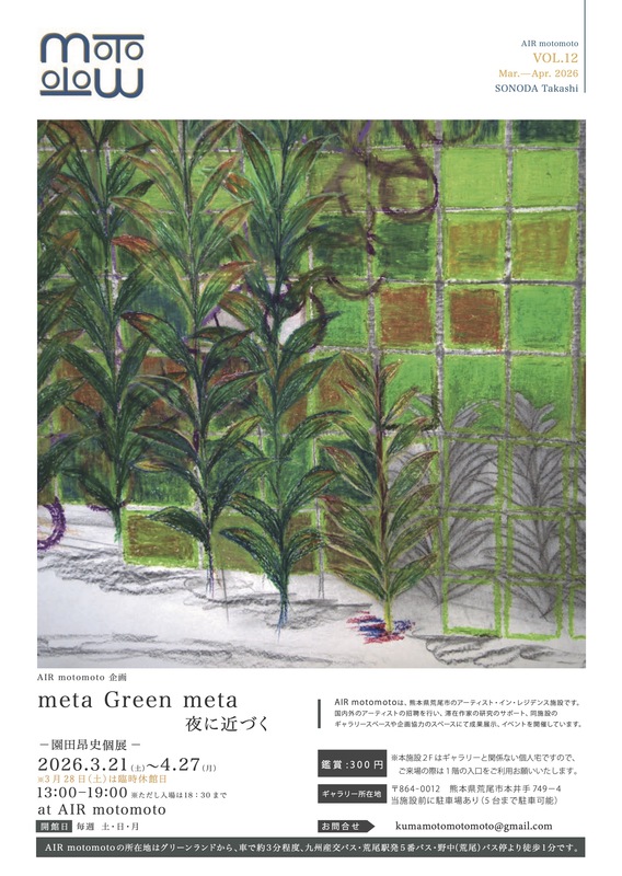 園田昂史は荒尾に2023年度に1度AIR motomotoに滞在しており、今回は2度目の本施設への滞在、制作、発表となります。