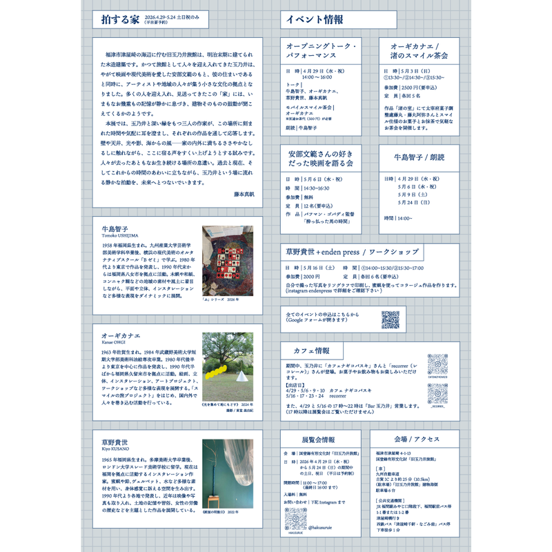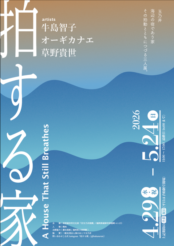本展では、玉乃井と深い縁をもつ三人の作家(牛島智子、オーギカナエ、草野貴世)が、この場所に刻まれた時間や気配に耳を澄まし、それぞれの作品を通して応答します。壁や天井、光や影、海からの風家の内外に満ちるささやかなしるしに触れながら、ここに宿る声をすくい上げようとする試みです。人々が去ったあともなお生き続ける場所の息遣い。過去と現在、そしてこれからの時間のあわいに立ちながら、玉乃井という場に流れる静かな拍動を、未来へとつないでいきます。
