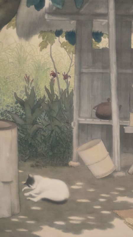展覧会の冒頭を飾るのは千草掃雲の≪木陰≫。八丈島特有の強い日差しを避け、木陰でまどろむ猫がとても愛らしい作品です。