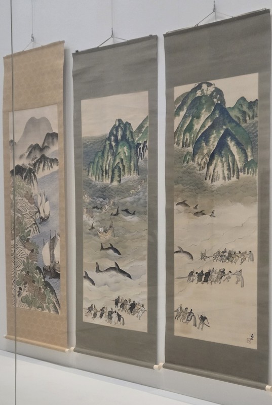 冨田渓仙は福岡市出身の日本画家。この≪沖縄三題≫は沖縄のイルカ漁を題材に描いた作品です。本土とは異なる光景を目の前にした作家の興奮が伝わってくるかのようです。