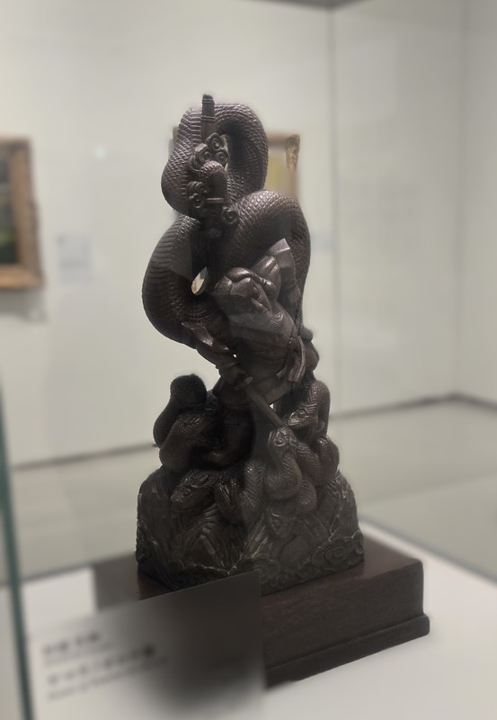 異国である南国に憧れ、実際にパラオ諸島を訪問し民俗史料の収集に尽力した民俗学者の土方久功による、現地の材料や手法を用いた彫刻作品群です。また、土方と共に南洋諸島に駐留していた杉浦佐助は、海軍少将の市丸利之介の依頼によて≪ヤマタノオロチ像≫を制作していますが、本作は鉄木という南国特有の素材が用いられています。