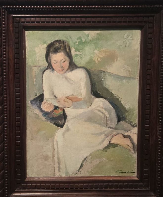 なお、こちらは本展覧会には展示されていませんが、ベトナム人画家のルオン・スアン・ニーが1940年に描いた作品《読書する若い娘》です。本作は日本がベトナムから撤退後のフランスの植民下にあった時代の作品ですが、作風に似たようなニュアンスを感じませんか。実は近代美術草創期を担ったベトナム人美術家たちが、新たな時代にふさわしい祖国を絵画を描くにあたり、近代日本美術の影響があったとも言われてます。