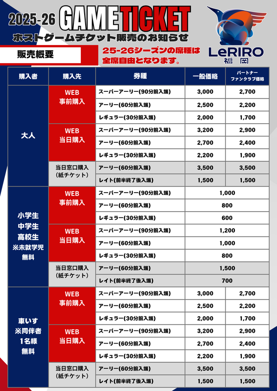 ルリーロ福岡のホストゲームを観戦できる単日チケットです。2025-26シーズンは全席を自由席とし、3種類のオプションをご準備しています。それぞれのオプションによって早期入場や駐車場の優先予約などの特典がついてきます。 ぜひ、早めの入場で見やすい席を確保して、試合前の演出を含めてお楽しみください。