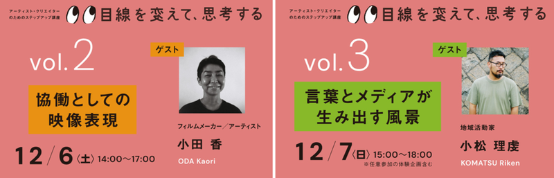 今後の予定は、フィルムメーカー・アーティストの小田香氏による『協働としての映像表現』(12/6)、地域活動家の小松理虔氏の『言葉とメディアが生み出す風景』(12/7)の2回、ファシリティターは、これまでもアートと社会をつなぐ仕事を多く手掛けてこられた橋本誠氏(企画・編集者/合同会社生活と表現 代表)が担当されます。