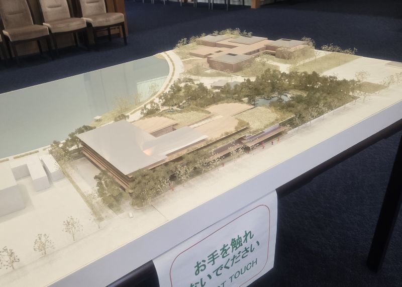 ワークショップは事前申込制で、定員300名がすぐに埋まるほどの人気でした。参加者の期待の高さがうかがえます。会場の能楽堂ロビーには新県美の模型が展示され、大濠公園の池面や福岡市美術館との位置関係などがよくわかります。