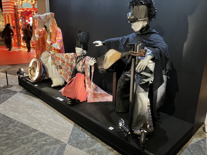 Mrs. GREEN APPLEが実際にミュージックビデオ撮影やステージで着用した衣装や小道具が展示される「COSTUME RUNWAY」。写真は「クスシキ」のもの。展示されている楽器は福岡展初公開になる。また最新曲「lulu.」で実際に使用した衣装も展示されているので、ぜひチェックしてみてほしい。