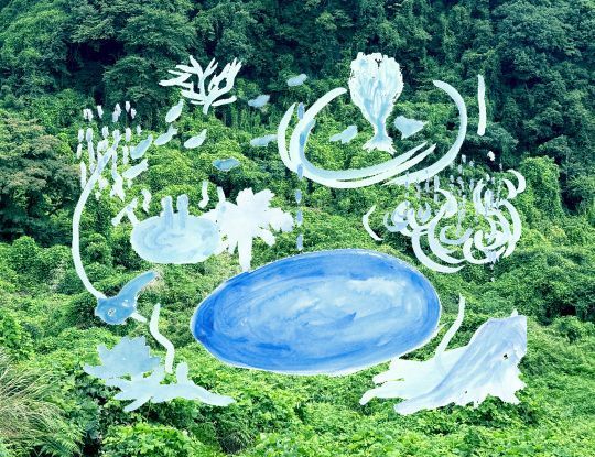 今回の作品の舞台は、別府市の中心部から離れた柳・隠山地区。かつて田畑であったことを忘れるほどに草木が生い茂り、鳥や虫の声にあふれた場所に、突如現れる‟宙に浮かぶ大きな水たまり“と作家が表現する直径約3.5m、高さ約3mの円形の水盤には、空が写り込み、時折、波紋が浮かびます。