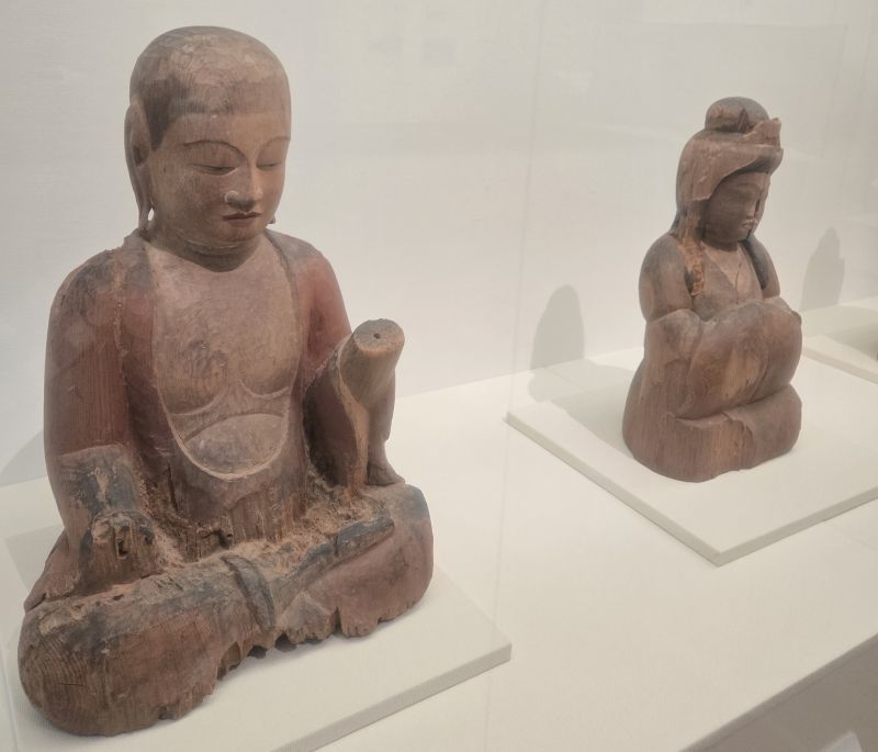 第1章の「八幡信仰の至宝」より、木造僧形八幡神坐像です。八幡神という日本古来の神が大陸伝来の仏に帰依した僧侶の姿で描かれており、典型的な神仏習合の坐像です。本像は大分県杵築市の奈多宮(宇佐神宮の別宮という伝承を持つ)に伝わる神像のひとつです。奥に見えるのは木造女神坐像(比売大神)です。