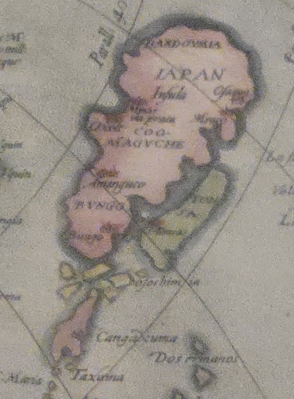 あまり鮮明ではありませんが、日本国部分を拡大した図です。「JAPAN」と書いてありますね。おそらく関西以西の情報をもとに描かれたのだと思われますが、よく見ると「BVNGO(豊後)」がひときわ大きく記載されていることがわかります。当時、いかに豊後国が国際都市として栄えていたのかを知ることができます。
