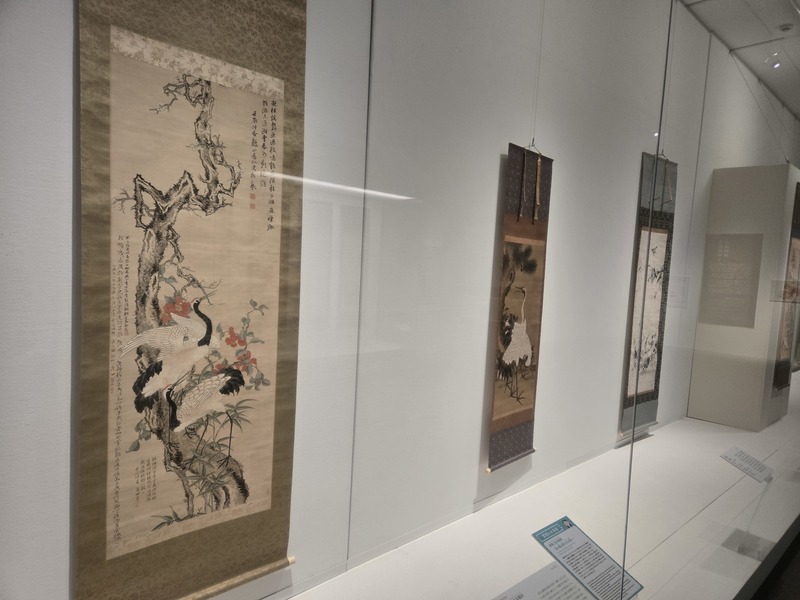 渡辺鶴洲の「双鶴図」はその中国絵画の技法を取り入れた作品です。よく見ると、胡粉等を用いた極細線で描かれた羽の表現は伊藤若冲にも似た作風が感じられます。当時の最先端の技法を用いて描かれていたことがわかります。